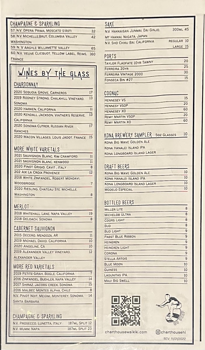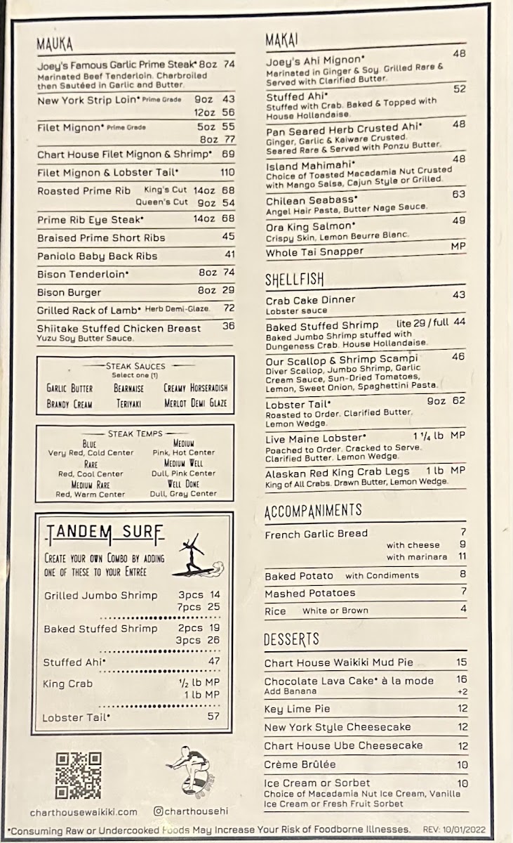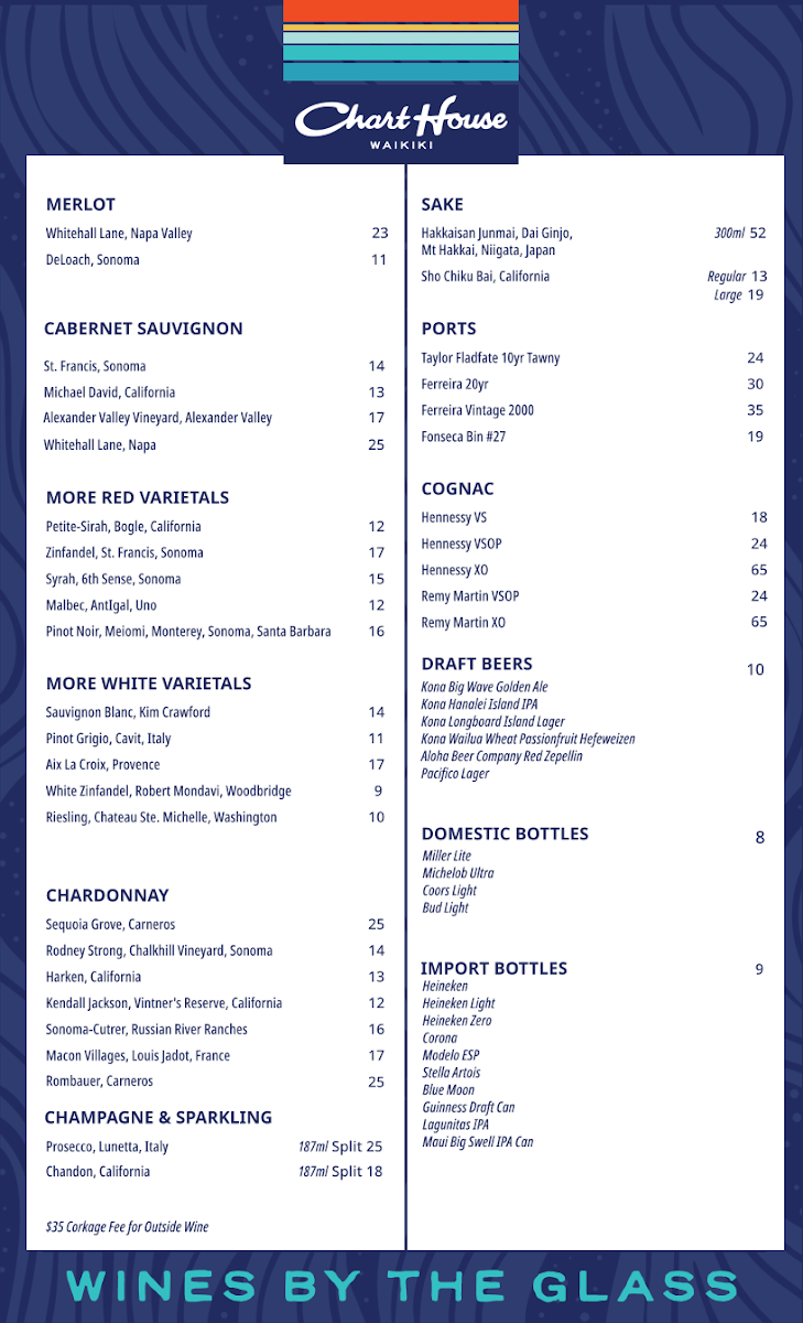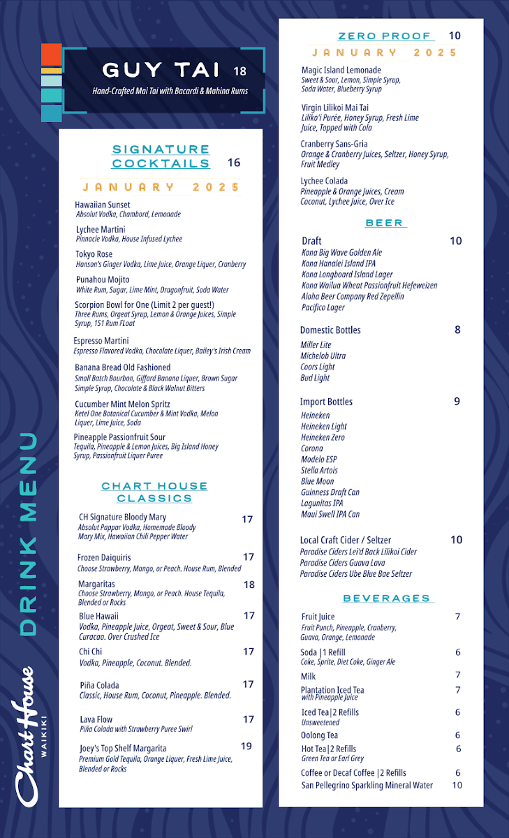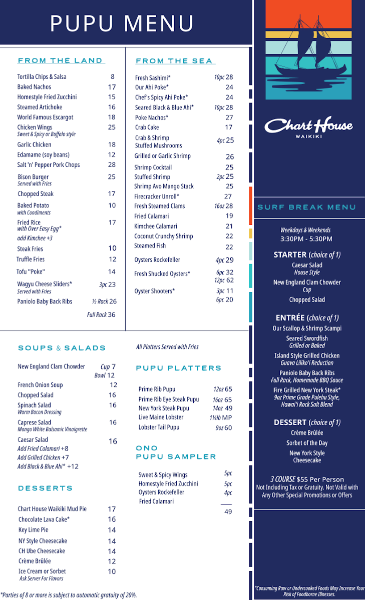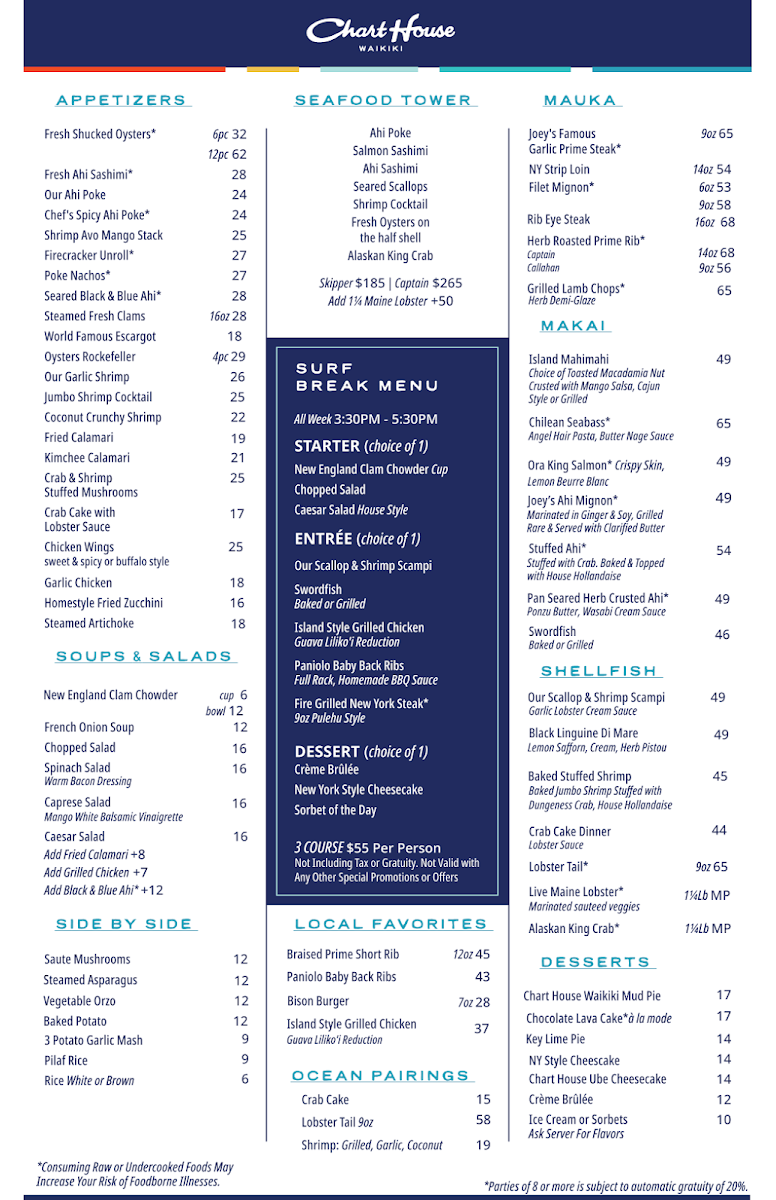 As you step into Chart House, the rich aroma of the ocean greets you, promising a culinary adventure that's both exciting and satisfying. The menu boasts an impressive selection of appetizers and entrees, all expertly crafted to showcase the freshness of the Pacific. Don't miss the Fresh Ahi Sashimi, a true testament to the islands' bounty, with its silky texture and rich flavor that instantly transport you to the shores of Hawaii. For those seeking a twist on tradition, the Poke Nachos offer a playful yet indulgent take, layered with crispy tortilla chips and creamy sauce that's sure to tantalize your taste buds.